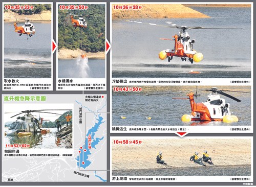 民航处及飞行服务队人员,分别乘直升机在上空视察,并拆开引擎外壳检查;相信要待一至两日拆走部分零件才能吊走。