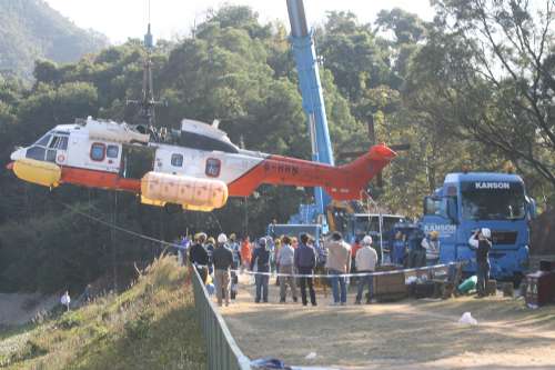 飞行服务员联同消防处人员,昨日中午开始用小艇将直升机由急降的位置,拖行到一公里外的主坝旁,工作人员拆走部分组件,包括螺旋桨及尾翼,以减轻重量,又在机头及机尾位置绑上绳索,方便吊起机身,其后用重型吊臂,成功将直升机吊离水面,并搬上货车,稍后运返飞行服务队总部。