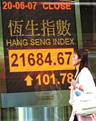 恒生指数昨日早段高开63点后,指数逐步攀升,最多升315点,创21897点历史新高。惟午后受内地股市转升为跌影响,升幅收窄,恒指最终收报21684点,升101点。而国指创新高后明显出现回吐,国指早段曾急升272点,更突破12000点心理关口,创12138点历史新高。但午后获利沽盘涌现,国指以近全日低位收市,报11905点,升38点。