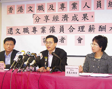 香港文职及专业人员总会权益委员会要求雇主起码加薪10%,以挽留员工。(左起)王吉显、吴秋北及李丽贞。