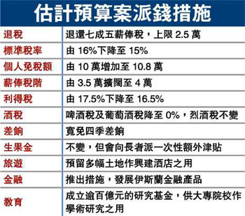 至于全港纳税人士预料今天也会收到喜讯。消息指,曾俊华将会在预算案中提出多项优惠纳税人的措施,包括增加免税额、扩阔税阶和退税等。退税方面,消息指政府将退还七成五薪俸税,上限为二万五千元;而个人免税额则回复至○二/○三年水平,由十万元增加至十万零八千元。薪俸税标准税率方面,由现时的一成六,降低至一成五;税阶则由三万五千元扩阔至四万元,惟边际税率可能维持不变。而为了增加营商竞争力,利得税亦可能会相应调低一个百分点,至百分之十六点五。