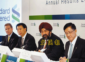 二月二十六日,渣打集团在香港举行二零零七年度全年业绩发布会。集团在二零零七年全年盈利录得增长百分之二十五(25%),达二百一十九点四一亿港元(219.41),其中经营收入八百六十三点二三亿港元(863.23),增长百分之二十八(28%)。在香港业务方面,渣打香港除税前营利九十三点零五亿港元(93.05),上升百分之三十四(34%),经营收入有一百六十一点三亿元(161.3),增长百分之二十八(28%)。图为渣打集团高层出席业绩发布会。 中新社发 邓庆乐 摄