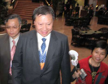 全国政协小组讨论会4日早上在北京贵宾楼举行。会议开始前5分钟,郭炳湘在5至6名保镖护送下忽然抵达会议场地外面的电梯大堂。穿上黑色西装和结上蓝色领带的他,一直以微笑示人,精神似乎不错。