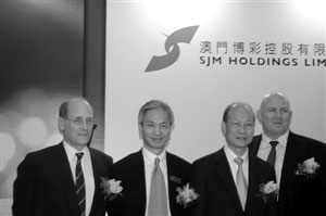澳门博彩控股行政总裁苏树辉、营运总裁吴志诚、业务发展总裁麦辉霆、财务总监麦文彬25日在香港香格里拉酒店介绍上市程序。
