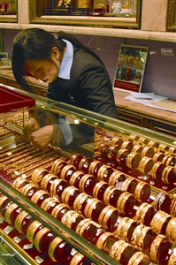 内地收紧自由行,珠宝首饰贵价品销情同受影响,连锁金饰店负责人指出,自由行收紧后,6月起生意额即见下跌,起码跌二至三成。一般而言,内地客购买珠宝首饰,广东客消费力稍逊北方客,前者人均消费额有三四千元,后者则达五六千元,主要看购买的货品类别而定。