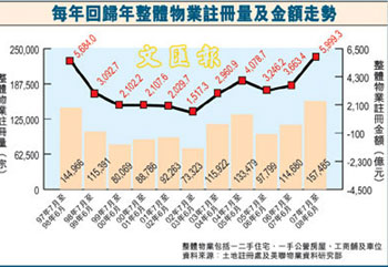 此外,一手公营房屋、工商铺及车位等其它物业注册宗数一共录得21969宗,而金额则有1003亿元,分别较前一年回归年增加19.5%及47.6%,当中金额亦为回归后的新二高位。