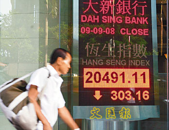 港股9日未能延续周一劲升860点的强势,就算美股高收近300点,恒指也跟随亚洲区股市下跌,刚开市已跌355点,最多跌近500点,下午跌势喘定,收报20491点,跌303点,成交额比周一大减200亿元至479.5亿元。