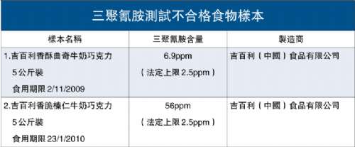 吉百利香脆榛仁牛奶巧克力的三聚氰胺含量为百万分之五十六,较法定上限的百万分之二点五,超出二十一点四倍;另一款吉百利香酥曲奇牛奶巧克力三聚氰胺含量为百万分之六点九,超标一点七六倍。