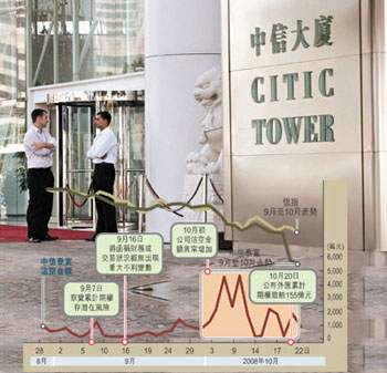 中信泰富股价继21日急挫55%后,22日再挫逾24%。(图片来源:文汇报)