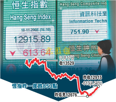 美国就业市场忧虑加深,美股跌223点,令18日外围股市也全线偏软,连内地上海A股也要急挫6.3%,港股低开231点后持续下跌,下午恒指随A股弱势曾经跌超过850点,低见12676点,尾市跌幅略为收窄,但仍守不住13000点大关,恒指全日收12915.8点,跌613.6点,成交448亿元。