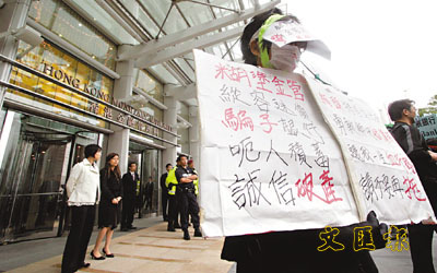 图为雷曼苦主在香港金管局前示威。图片来源:文汇报