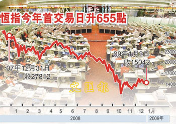 中新网1月5日电 据香港《文汇报》报道,温家宝总理在元旦日跟大家打气,中央再推“双十规划”促进经济,受惠股份如中资金融股、内需股、汽车股及家电股均被市场看高一线,加上受3G发牌刺激的电讯股,及“松绑”的内房股,预计5日复市的A股及港股将受惠利好消息而向好。