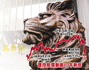 英国银行股周一被洗仓,汇控急跌,跌势持续至20日的港股,股价终跌穿60元大关,收报57.5元,跌7.7%,连跌7天后再创十年新低。恒指20日全日收报12959点,跌380点,跌幅2.9%,汇控已拖低恒指超过122点。