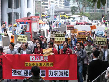 中新网2月9日电 据香港《大公报》报道,香港电盈小股东大联盟8日举行大游行,促请证监会尽快彻查电盈怀疑“种票”事件,约百名电盈小股东出席。