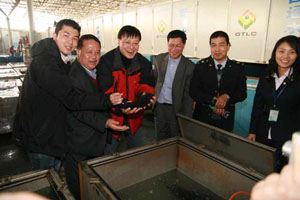 王国兴、黄容根等人在水产中转站了解新技术 来源:香港大公报