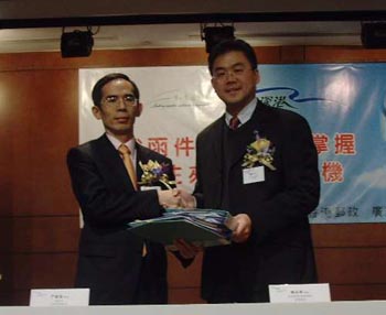 香港邮政助理署长蔡永祥(右)同深圳市邮政局副局长严建国在合作协议签署仪式上