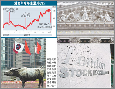 该媒体引述富时Mondo Visione的报告称,在金融海啸下,欧美的交易所市值急挫,港交所与巴西交易所的市值则在近月大幅回升,目前最大市值的交易所为美国的CME集团(芝加哥期货交易所),第二便是港交所,第三是德国交易所,第四为巴西交易所,伦敦交易所只占第十位。