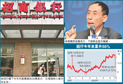 交银国际研究部主管杨青丽表示,为提高核心资本充足率,招行只能选择股本集资的方式,即在二级市场供股或对大股东定向增发。