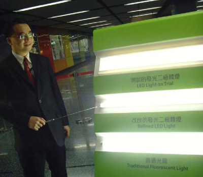 港铁去年初耗资四百万港元,在港岛、荃湾及将军澳三趟市区地铁列车进行车厢LED环保灯测试计划,港铁总结称,测试收到良好效果,除能有效节省能源外,LED灯的寿命较传统光管耐用高四倍,达五万小时,且更换时只需换走芯片便可,不会释放水银和制造光管垃圾。同时LED光线更接近自然日光,并不会释放紫外光,可保护乘客眼睛,在测试期间广为乘客欢迎。
