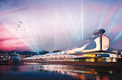 香港建筑署向立法会提交的文件展示邮轮码头构思图,占地7.6公顷的码头区具浓厚时代感,其中即将向立法会申请拨款58.5亿元兴建的码头大楼,外貌更犹如巨鲸游走维港,相信在晚上灯火通明下更具气势。