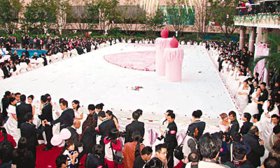 主办方还制作一个24.4×10.98米,总重量达千斤的巨大蛋糕,单是奶油就用了400斤,由9位厨师奋力20多个小时制作而成。这个大如一个篮球场的结婚蛋糕,将申请列入吉尼斯纪录。