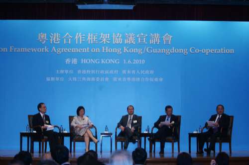 今年四月初,曾荫权和黄华华等粤港政府高层,在习近平等中央领导人见证下,签署《粤港合作框架协议》,揭开粤港紧密合作新篇章。昨日两地政府再度连手,共同主办宣讲会,意在向社会各界讲解《框架协议》对两地合作提出的六个明确定位和分工,以及两地如何通过功能互补、协调发展,共同提升整个区域的综合竞争力,以期让各界更能掌握《框架协议》的机遇。