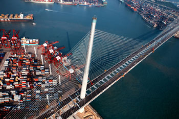 这条全球第二长的斜拉桥,首次引入“风向导流板”设计,减低受风时的摆动,同时配备风力及结构监测系统,预计每年维修费约600万元。