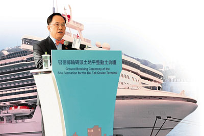 区内邮轮业务发展迅速,曾荫权指今年4月中央容许内地旅行团乘坐以香港为母港的邮轮经港赴台旅游,开拓两岸三地邮轮旅游业务,明年暂订有约20班次航程由香港出发前往台湾,将可接载3万名乘客。他又称,整体启德发展共分3个阶段进行,预计在2013、2016及2021年分期完成。