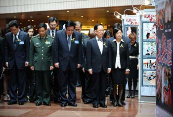 中新网5月13日电 香港《大公报》今日在“要闻”栏目刊发报道称,汶川大地震周年祭,东方之珠遥寄哀思。行政长官曾荫权连同中联办主任高祀仁出席地震图片展开幕礼,为死难者默哀。