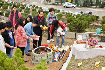 家族成员刘女士表示,祭品总值超过3000元,除部分洋酒、水果等食物会带回家之外,其它诸如“金表”、“西服”等纸扎祭品都会在拜祭后烧给先人使用。她表示,潮汕人对传统祭祀习俗非常重视,一年一次的拜祭先人一定是召集全家族齐出动。她又说:“年年祭祖,只有今年乳猪、烧鸡、水果等祭品是双份的,就连跪拜用的洋酒也带了两瓶。总之,大家的生活渐好,荷包也比往年涨一些,当然也希望祖先吃好过好。”家中最小成员赵同学说,自己专门准备了黄菊花和百合献给外公,“我今年是第一次来祭扫,还真没见过这么隆重的祭祀场面。”