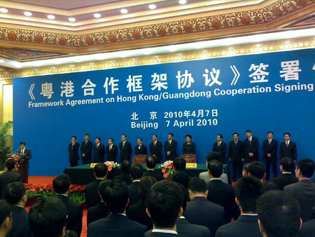 中新网4月7日电 粤港合作框架协议今天上午在北京签定。在国家副主席习近平见证下,协议由香港特区行政长官曾荫权及广东省省长黄华华签署。