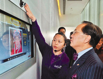 为推介香港馆,煲呔(曾荫权)不惜“粉墨登场”扮演粤剧大老倌?非也,原来香港馆在入口处欢迎参观者的是一个计算机造型游戏,曾荫权亲身上阵,一试游戏:“毋须粉墨也能装一下大老倌,然后把趣怪扮相电邮给朋友。”