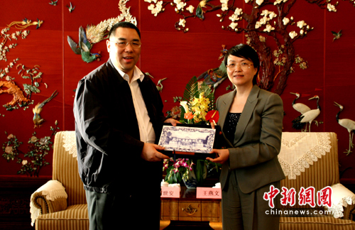 下午5时许,扬州市委书记王燕文在迎宾馆与澳门特首崔世安亲切交谈并互赠礼品。