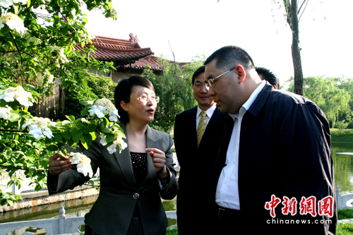会见前,扬州市委书记王燕文向澳门特首崔世安特别介绍在他下榻迎宾馆门前的扬州市花—琼花,琼花有着“维扬一枝花、四海无同类”的美誉,崔世安在此欣然留影纪念。