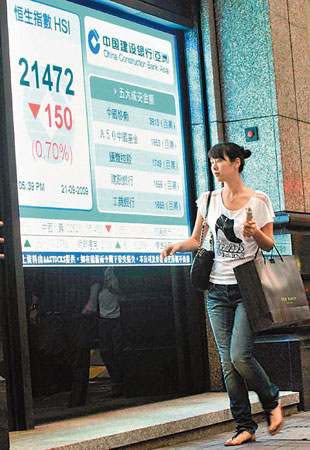 汇控跌0.27%,收报90.95元,结束连升4天的强势。中移动逆市升0.58%,报78.4元。内银股跌幅较大,中行挫3.2%,信行跌2.4%,工行跌2.3%。地产股及航运股弱势,恒地挫3.1%,有李嘉诚增持的长实跌0.75%,收市报99.1元,中远洋跌1.8%,太航跌2.2%。