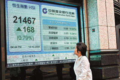 中新网10月14日电 据香港《文汇报》报道,外围造好,港股13日曾升过379点,但午后高位遇阻力,急剧回调逾200点,从高位21679点,收窄至21467点才报收,全日升168点,成交604亿元。