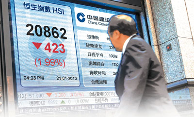 中新网1月22日电 据香港《文汇报》报道,内地去年超额完成“保八”目标,12月居民消费价格指数(CPI)涨幅更大升至1.9%,超出市场预期,投资者担心内地将提早加息,并加快退市步伐,加上隔夜美股疲弱、希腊财政问题或扩散至葡萄牙令美元急升,资金撤港汇弱,种种因素令港股21日再大跌423点或2%,失守21000点,大市两天共泻815点。