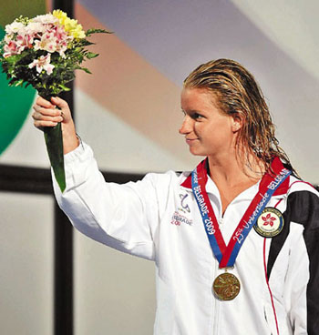 中新网7月9日电 据香港《星岛日报》报道,“港产鬼妹仔”韦汉纳为香港扬威,8日于贝尔格莱德举行的世界大学生运动会,在百米自由泳打破外国垄断,为香港赢得历史性首面金牌,同时打破大会纪录。