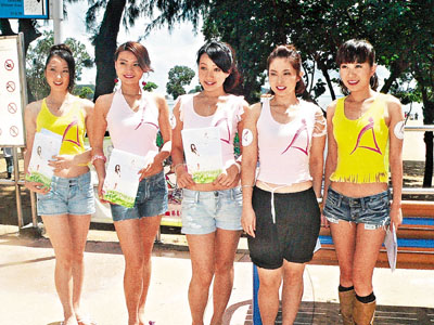 张家莹、吴嘉星及筱靖各人身穿印有亚洲小姐标志的T恤,拉队到浅水湾向沙滩上具有潜质的女泳客招募参选。