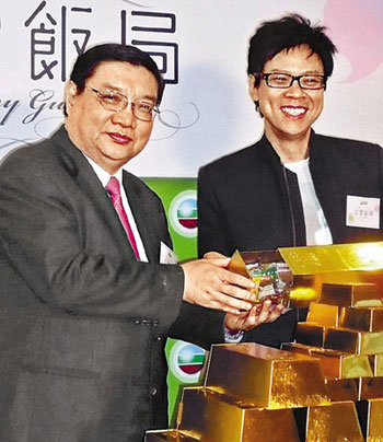 中新网8月14日电 据香港《文汇报》报道,香港无线总经理陈志云13日邀请财经界名人曹仁超接受《志云饭局》访问,更送上多条大金砖给曹仁超。陈志云大爆曹仁超爱收藏金砖,最高峰时期家中有三个保险箱摆放金砖,收藏黄金1000两,即相等于眼前的金砖约40条。