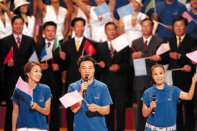 陈奕迅(中)、朱哲琴(右)、蔡妍曾在百日倒数晚会上演唱东亚运动会国际版主题曲《You Are the Legend》。(图片来源:香港文汇报)