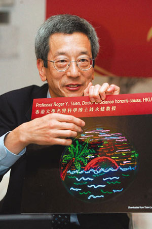 继香港大学8日向钱永健颁授荣誉博士荣衔外,香港中文大学10日也会向他颁发荣誉理学博士,并由特首曾荫权亲自颁授。钱永健在香港的行程紧凑。他9日首先出席公开讲座,以“点绿成金”为题,在香港大学发表演说,当中展示了他的实验室的最新研究进展。