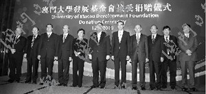澳门大学发展基金会接受捐赠仪式昨晚举行,行政长官崔世安,社会文化司司长张裕,澳门教区主教黎鸿升,澳大发展基金会创立人代表、信托委员会副主席谢志伟,澳大校长赵伟,副校长何顺文、马许愿及黎日隆等政府官员、澳大领导及社会人士出席。