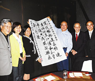 会上,梁美芬送了一幅字画给胡志强作见面礼,上面写有她创作的一首赋:“宽宽畅畅通海峡、连连延延香江情、和和平平谋共识、安安乐乐创繁荣”。胡志强也礼尚往来,充分发挥其幽默本色,说“从政就是要所有人快乐”。