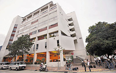 六月十六日上午,穿着保护衣的防疫人员到香港湾仔邓肇坚维多利亚官立中学校园进行清洁。该校有学生确诊感染H1N1流感后,当局宣布即日起停课两星期。 中新社发 张勤 摄