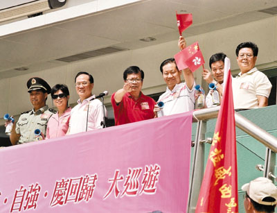 中新网7月2日电 据香港《文汇报》报道,香港回归12载是喜庆的大日子,港九各地色彩缤纷,港人喜气洋洋,大巡游主要嘉宾七彩缤纷的服饰也与此辉映。