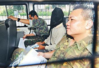 持双程证来港的被告许胜其(42岁),被捕多日后,神情略见憔悴,而他仍身穿第一次上庭的米色长袖上衣,一头短发依旧凌乱,但双手不再系以铁链,由三名庭警和一名惩教署职员押解上庭。他在应讯期间双手一直放在身后,专注听主控官和律师的发言,表现冷静。