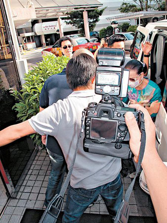 中新网9月8日电 据香港《星岛日报》报道,澳门赌王何鸿燊二太蓝琼缨于7日下午4时15分现身港安医院探望丈夫,戴上口罩的她从侧门内进,期间也有向记者说了声:“Hello!”