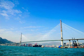 造价三十七亿元的昂船洲大桥位于葵涌码头入口,横跨蓝巴勒海峡,连接长沙湾和青衣岛,总长度一千五百九十六米。桥面悬于海面上方七十三点五米,是世界上最高的桥梁。大桥是继江苏苏通大桥之后,全球第二长的斜拉桥,用二百二十四条表面刻有凹纹的斜拉索巩固,可减低因风雨震动拉索对大桥所造成的影响。大桥的主跨是高强度钢材建筑,令桥身更薄更轻。大桥寿命可达一百二十年,预计每年的维修费用达一千万元。