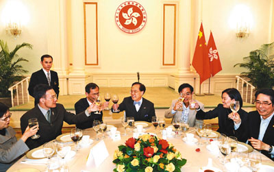 曾荫权5日在礼宾府筵开5席,来自各党各派的约40名议员依时赴会,财政司司长曾俊华、律政司司长黄仁龙及大部分局长和副局长也同为座上客。据引述,曾荫权在午宴上致辞时向议员们笑说,议事之外都有人情,火花之外都有风花雪月,5日的宴请是希望大家除了公事之外,也有多些沟通和交流。